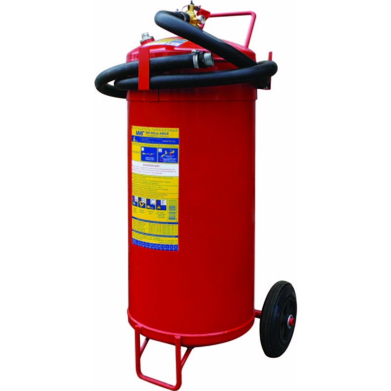 Огнетушитель порошковый закачной, вместимость корпуса 63 л, масса заряда порошка 50 кг, длина струи 6 м, продолжительность подачи 20 сек, огнетушащая способность 6А, диапазон рабочих температур -50…+50°С, длина шланга 3 м
